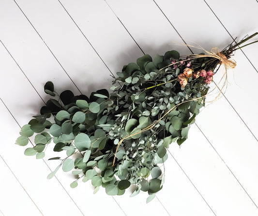 Fresh Eucalyptus Wall Hanging Swag With Dried Roses, Fresh Wreath, Farmhouse Rustic, Wedding Decor, Kitchen Wall Decor, Mothers Day Gift,