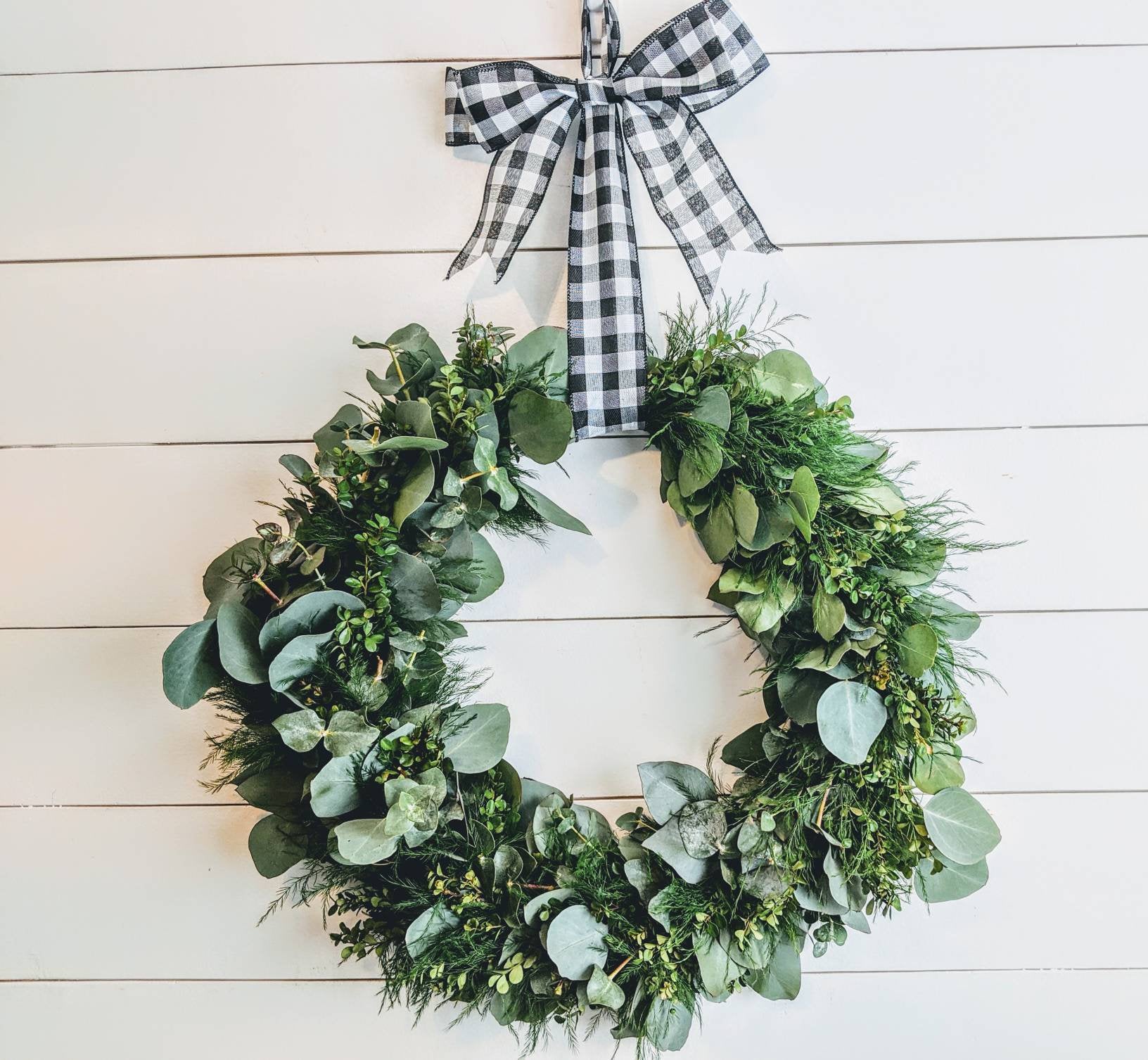 Fresh Eucalyptus Boxwood Wreath for window and door with buffalo plaid bow, Green Wreath, Rustic Wreath, Farmhouse Wreath, Wedding Wreath