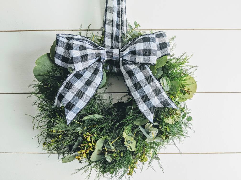 Fresh Eucalyptus Boxwood Wreath for window and door with Buffalo plaid bow, Rustic Wreath, Farmhouse Wreath, Wedding Wreath, Kitchen Wreath