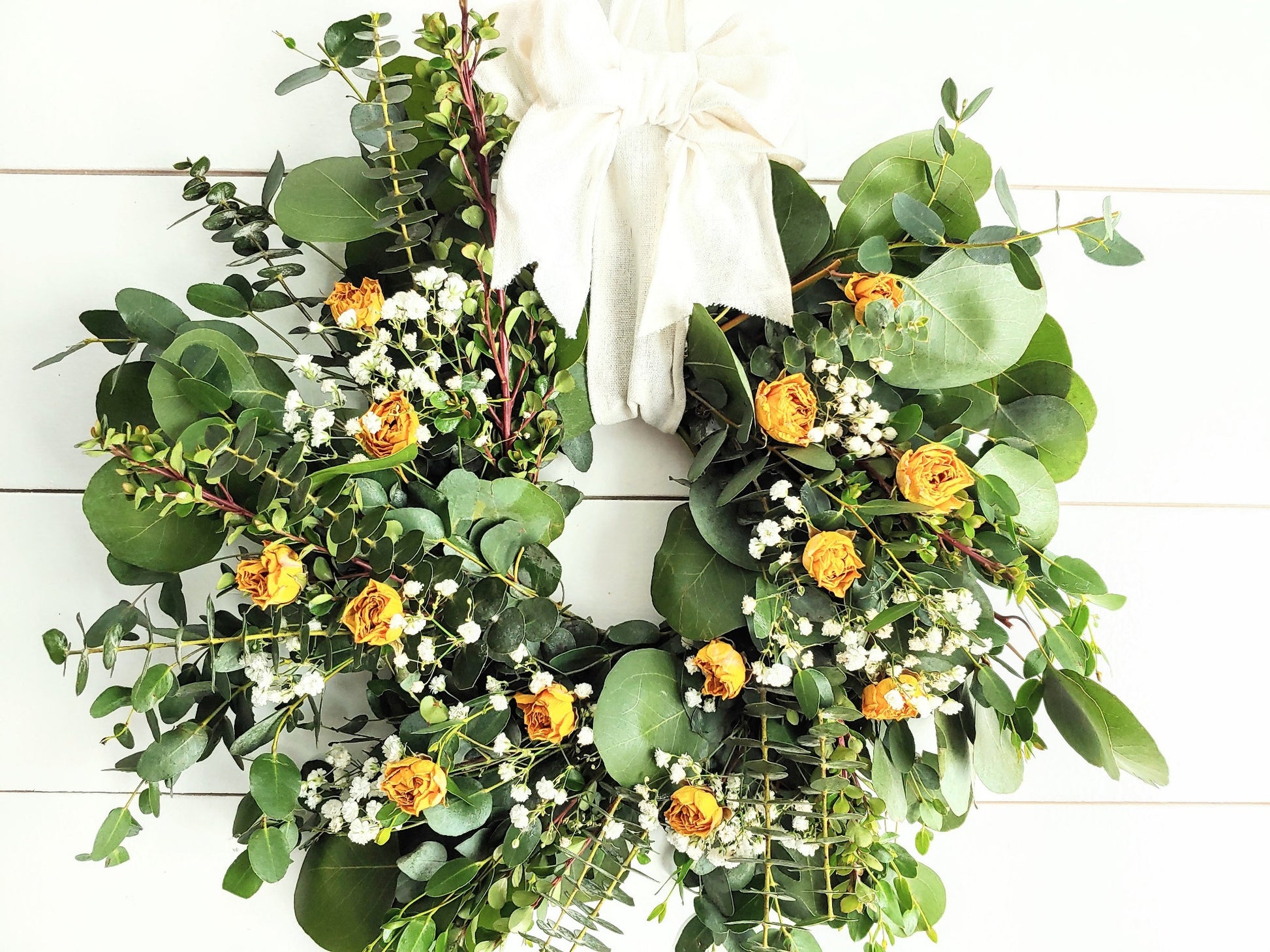 Beautiful Fresh Real Eucalyptus Boxwood Wreath with dried roses and babies breath flowers.