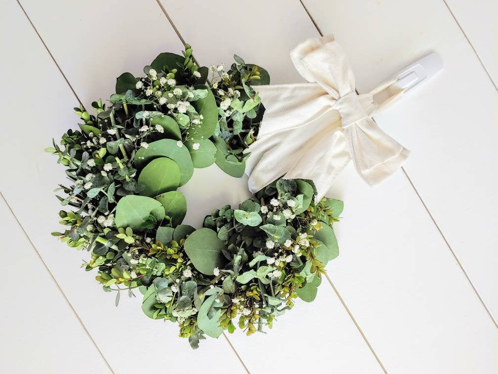 Fresh Eucalyptus Boxwood Wreath With White Bow and Real Baby's Breath Flowers, Green Wreath, Farmhouse Wreath, Rustic Wreath, Wedding Wreath