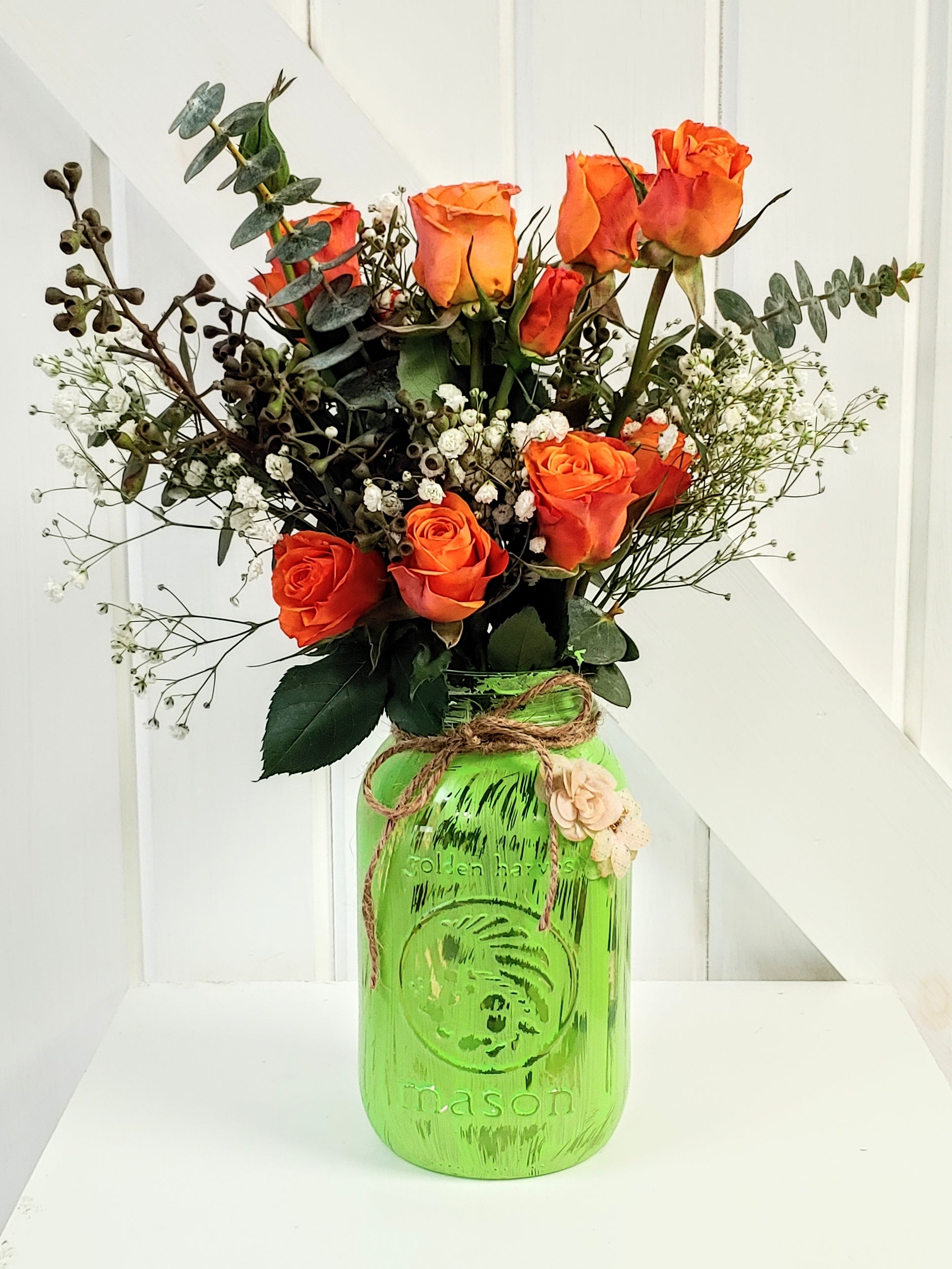 Hand Painted Mason Jar Floral Arrangement Lime Green